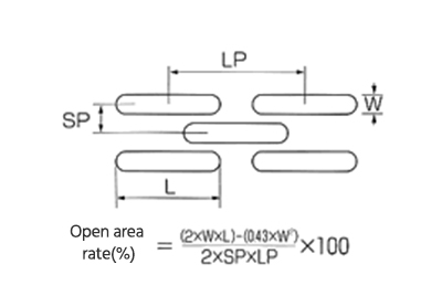 V/p = open area (%), D = holes diameter (mm), P = holes pitch (mm), v/p = (D2*90,7)/p2